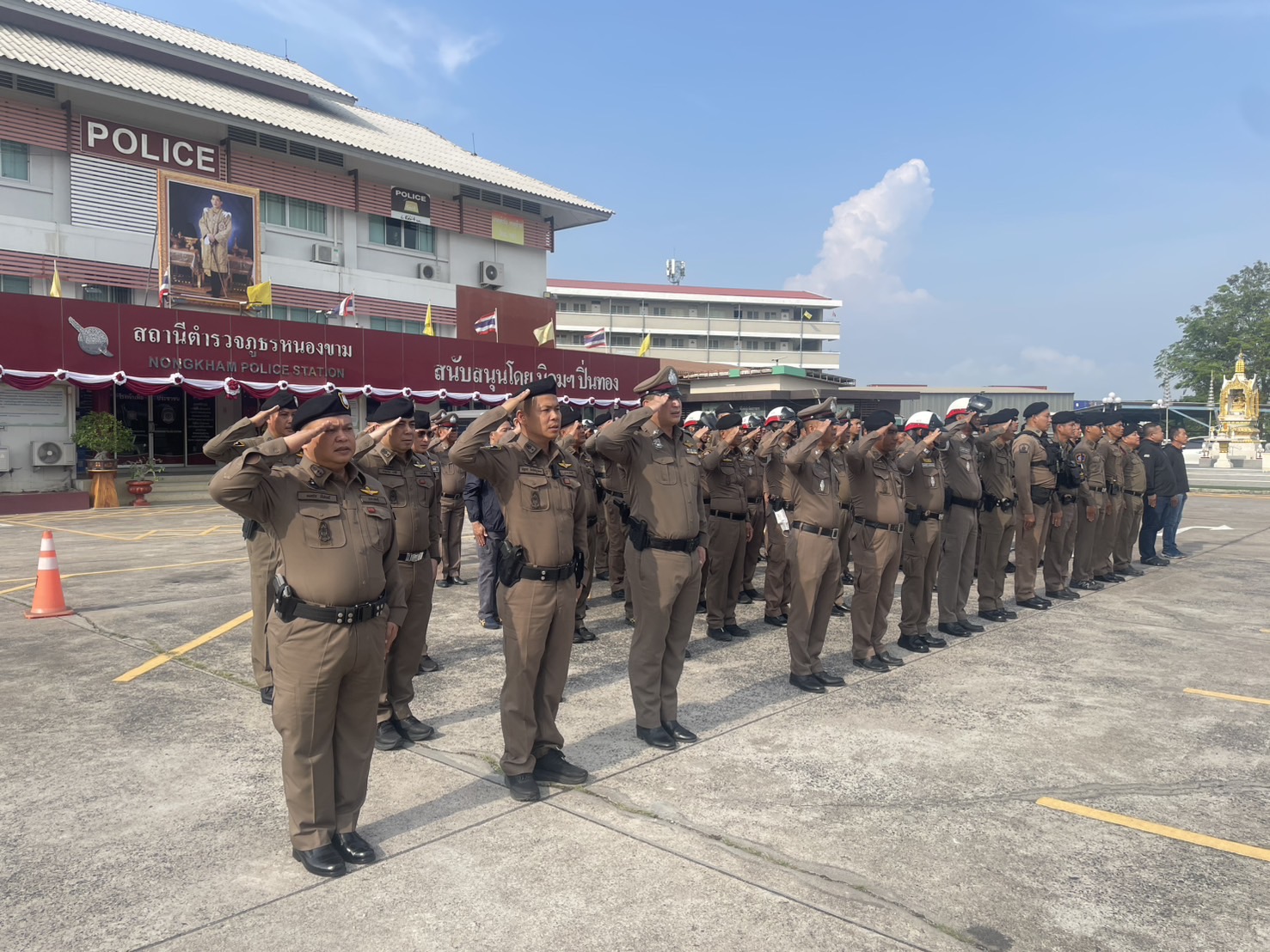 พร้อมด้วยข้าราชการตำรวจ สภ.หนองขาม ร่วมเข้าแถวเคารพธงชาติ สวดมนต์ท่องอุดมคติตำรวจ ท่องคำปฏิญาณตำรวจ ประชุมชี้แจง ข้าราชการตำรวจสภ.หนองขาม