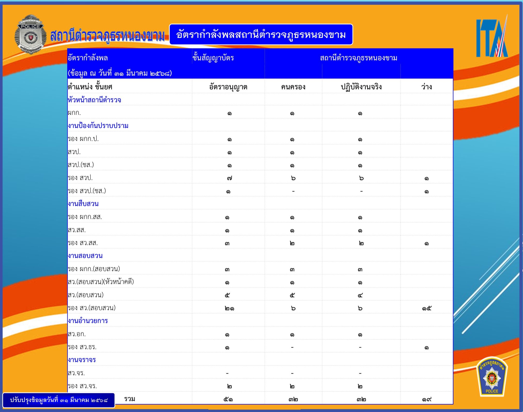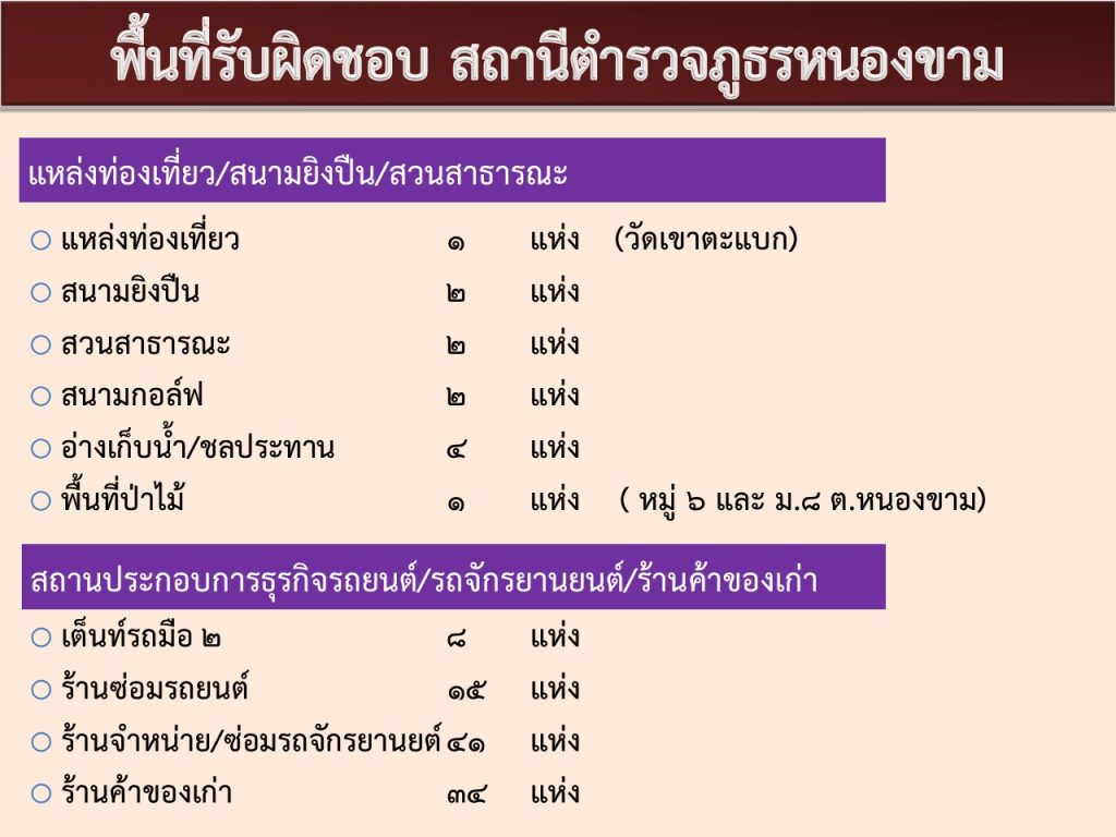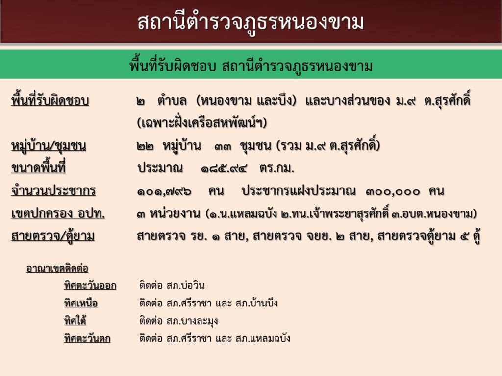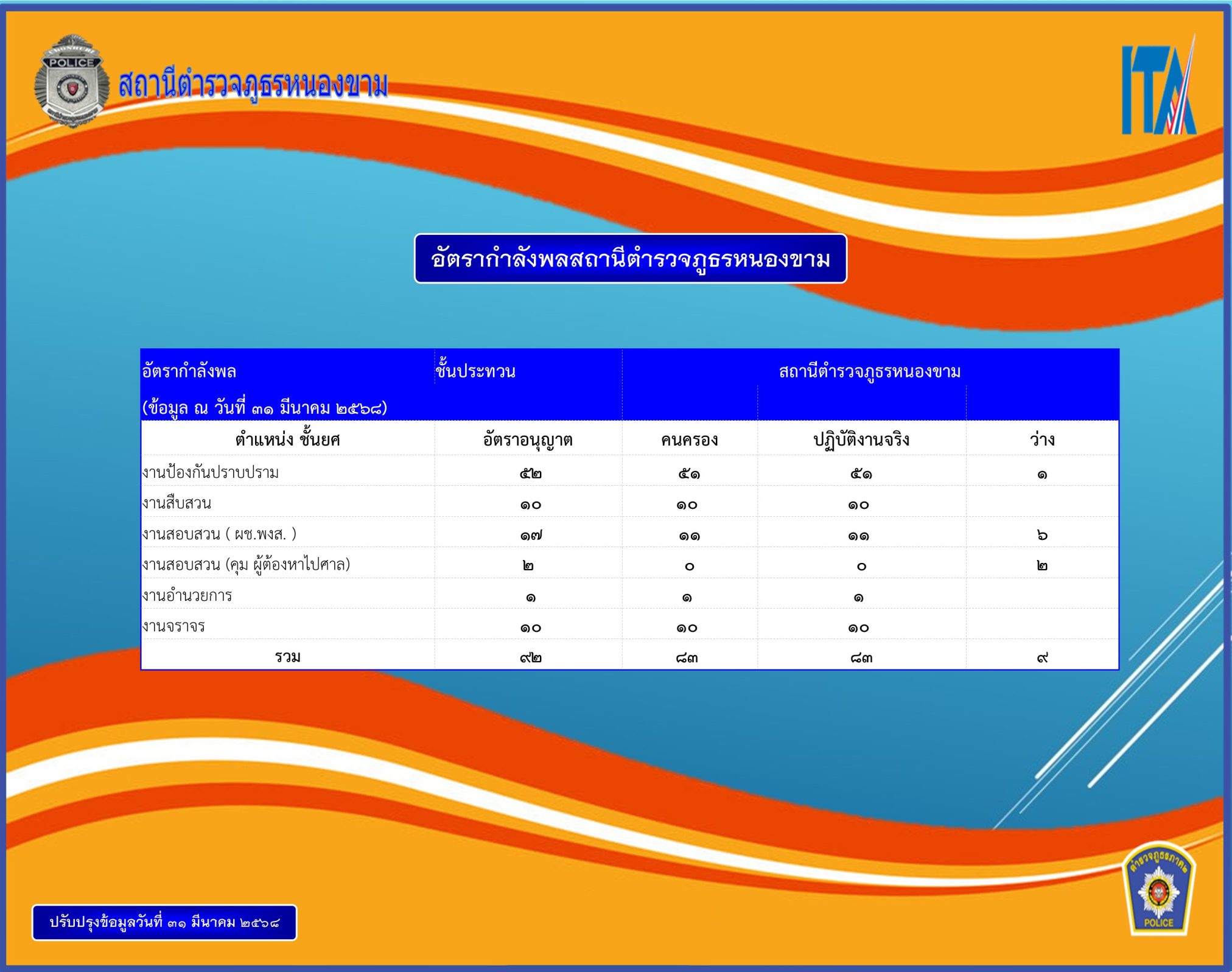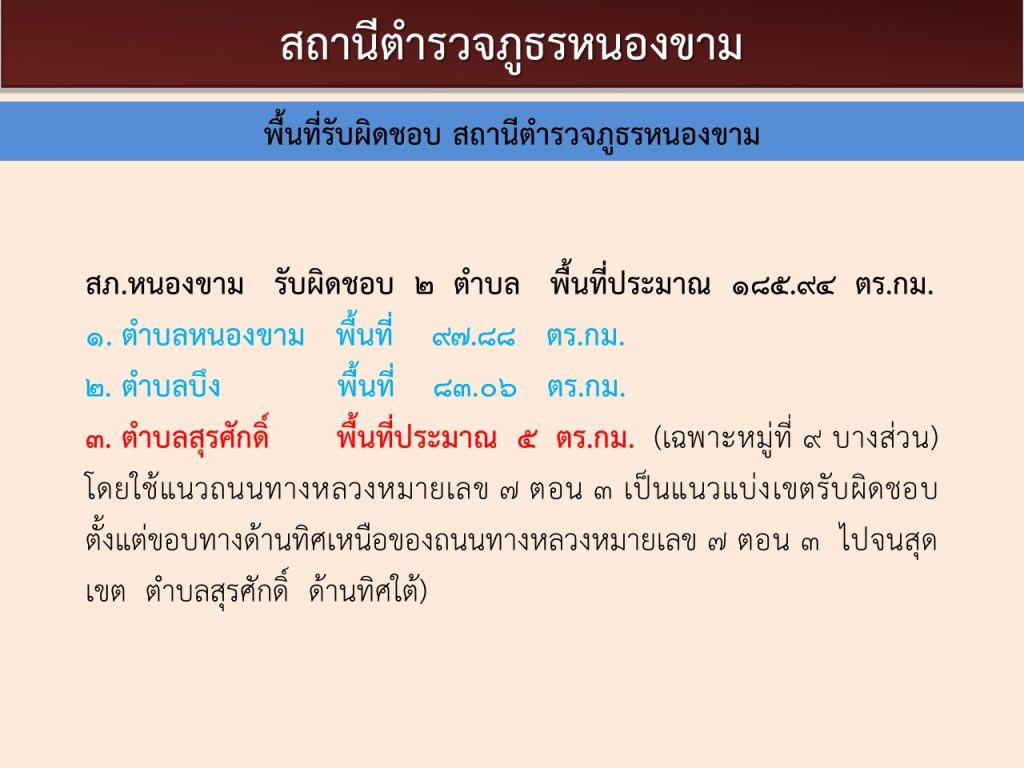 O2 ข้อมูลผู้บริหาร อัรากำลัง และพื้นที่รับผิดชอบ ผู้บริหารสถานีตำรวจภูธรหนองขาม ข้อมูลอัตรากำลังสถานีตำรวจภูธรหนองขาม พื้นที่รับผิดชอบ สถานีตำรวจภูธรหนองขาม ข้อมูลประชากรในพื้นที่รับผิดชอบ